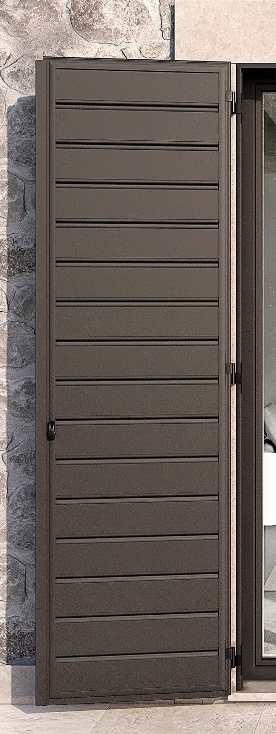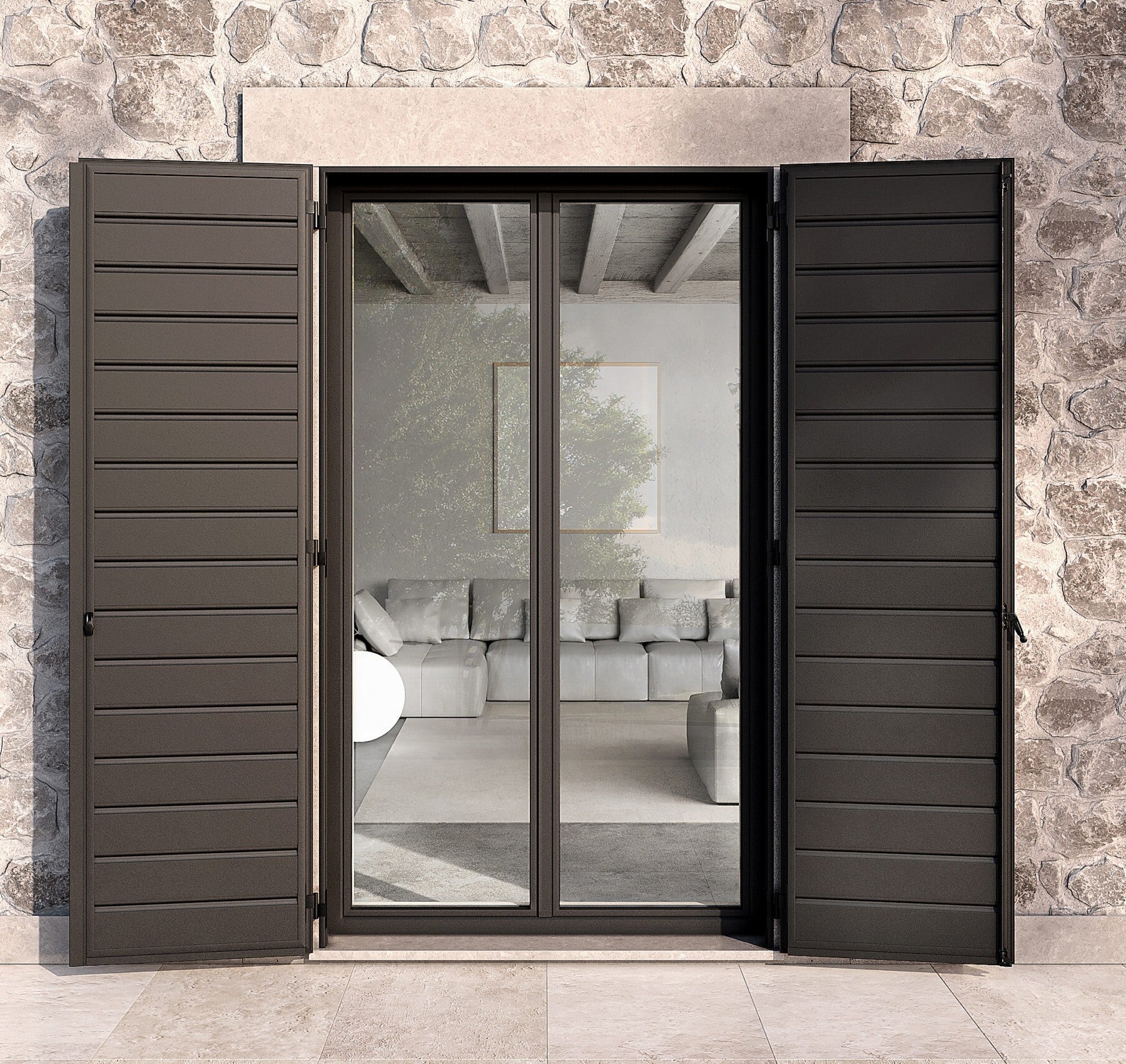 Aurora reinterpreta la tradizione della doga “scandola” con uno stile pulito ed essenziale. Il profilo anta resta completamente nascosto, lasciando a vista solo le doghe sia all’interno che all’esterno, per un design uniforme ed elegante. È disponibile anche nella versione con doghe coibentate in EPS, che migliorano l’isolamento senza alterare estetica e struttura. La possibilità di differenziare il tipo e il verso delle doghe interne ed esterne rende Aurora una soluzione versatile, capace di adattarsi a ogni esigenza architettonica.